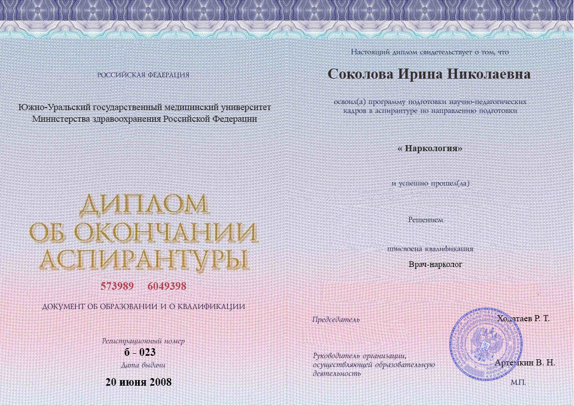 - Переподготовка и повышение квалификации в Южно-Уральском государственном медицинском университете по направлению лечения зависимостей от химических веществ.